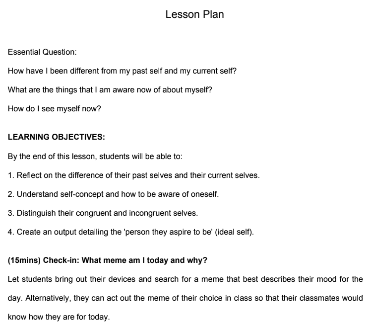 This lesson plan encourages self-reflection and self-awareness through writing, drawing, and discussion activities. Students will compare their past and present selves, explore self-concept and congruence, and identify their ideal self. Activities include sharing personal insights, writing a letter to their past self, and creating an illustration of their "ideal self."